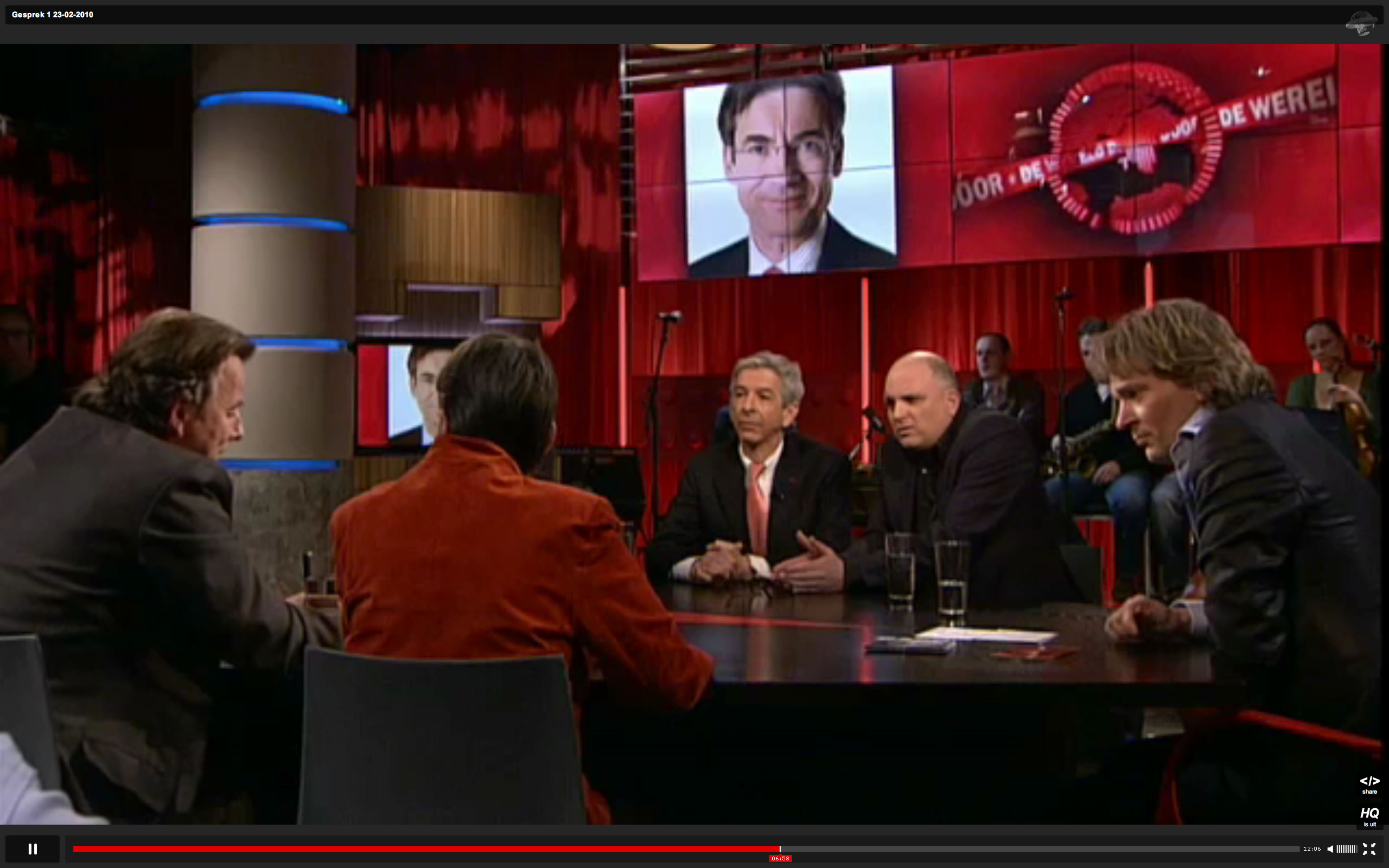 Rottenberg "OK dat heeft u niet bijgehouden.." (...) Koenders: "mag ik even uitspreken..." en een virtuele Verhagen als lachende derde en geheel rechts Matthijs van Nieuwkerk die de regie verloren heeft.