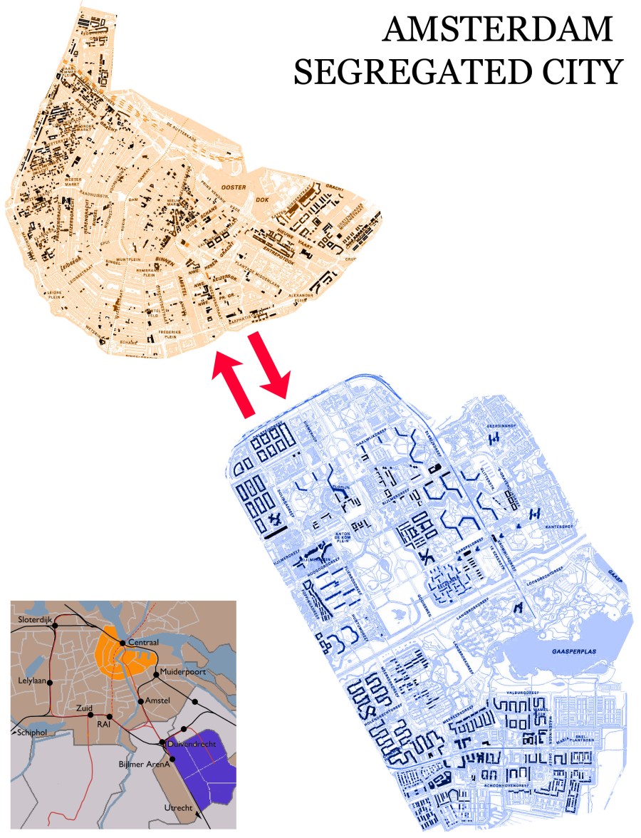 A “segregated city” I said, so let me try to show how this translates into a map for the case of the Bijlmermeer suburb build in the early sixties, conceived in the fifties as an ulimate pure example of the ideas of the CIAM (Congrès International d’Architecture Moderne) with their separation of functions: living, working, recreation, traffic. Later in the eighties and nineties the urban concept has been remoulded into amore classic integrated street model with rows of suburban houses. Maybe the red arrows in the map below should be just blue… as the inhabitants of the Bijlmermeer are commuting on a daily basis to the inner town. The inhabitants of the inner town on the other hand hardly ever will go to the Bijlmermeer.
