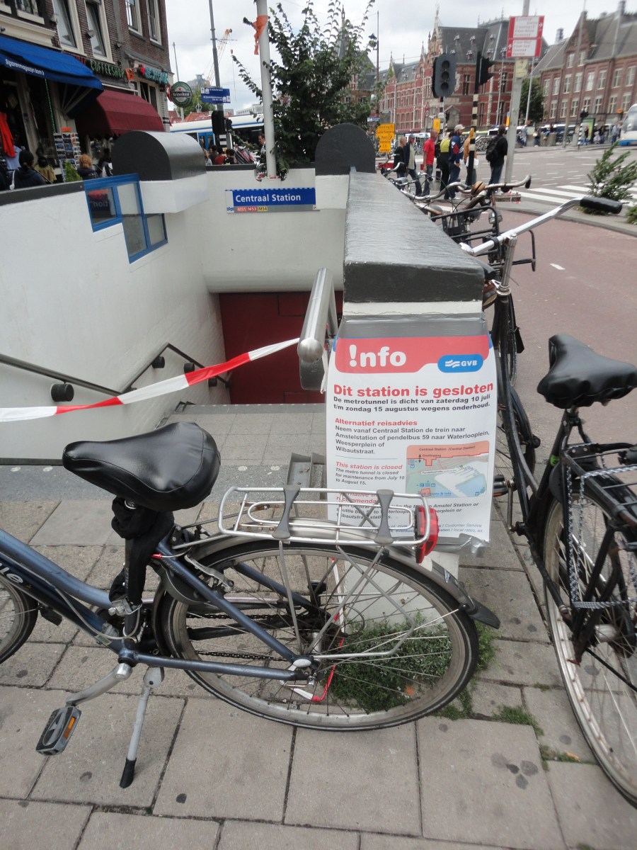 It is (only) thanks to the upcoming SAIL tourist event – where eager entrepreneurs hope to welcome a million extra clients – that the wind will blow some life into the subterranean public transport system. The photograph above shows a clumsy sign at one of the entrances of the subway system at the Central Station. At the most central Waterlooplein subway station that can be seen from my window there was NO sign whatsoever about why the doors were closed, till when and how to get to the Bijlmer-ghetto from here…