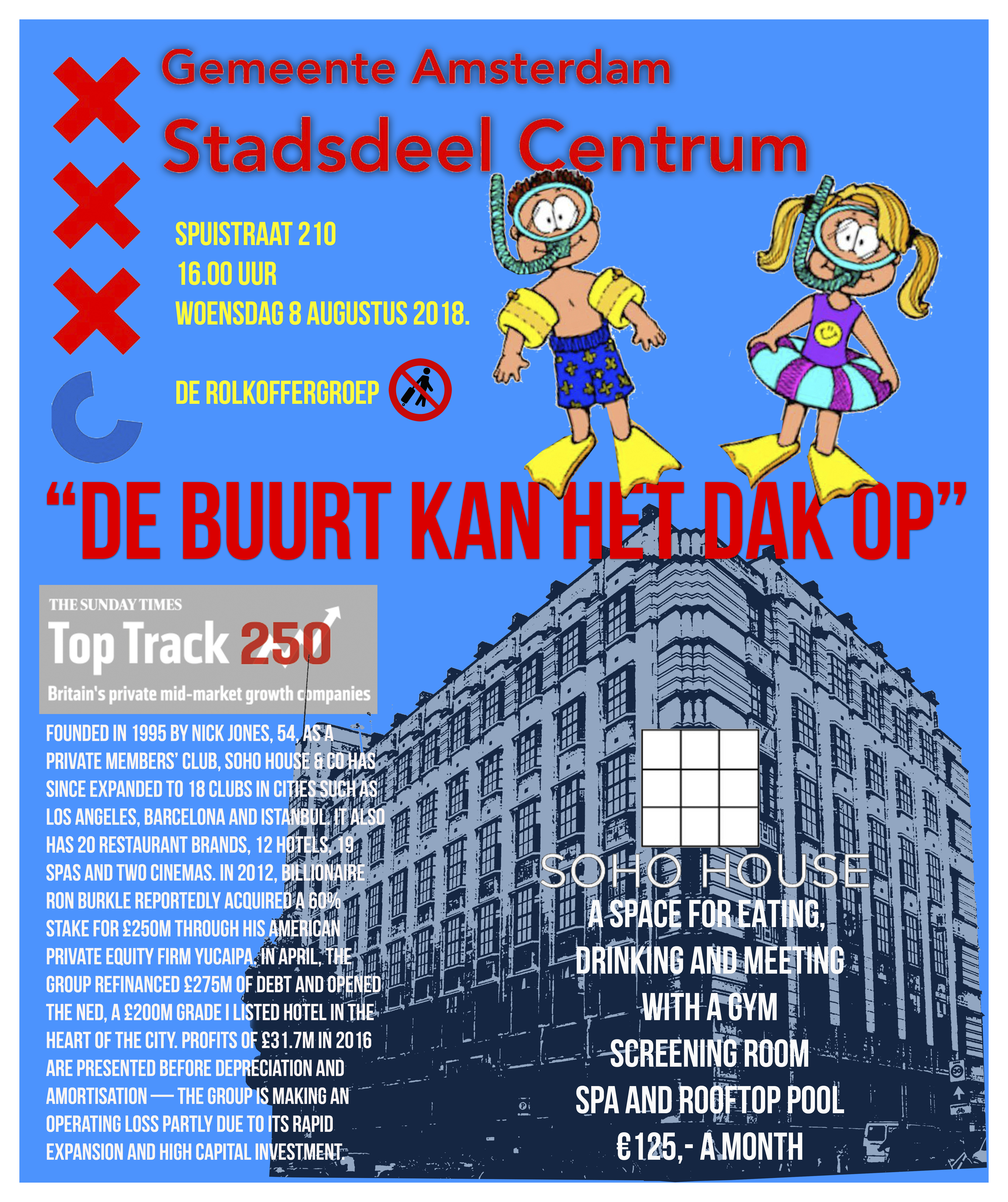 Posted in Amsterdam World Village, tagged Amsterdam University as property speculator, Bunge Huis, citizens protests, gentrification, Nick Jones, Rolkoffergroep, rooftop swimming pool, Soho House Amsterdam, Spuistraat 210 Amsterdam, Wijkcentrum d;Oude Stadt on August 7, 2018| Leave a Comment »