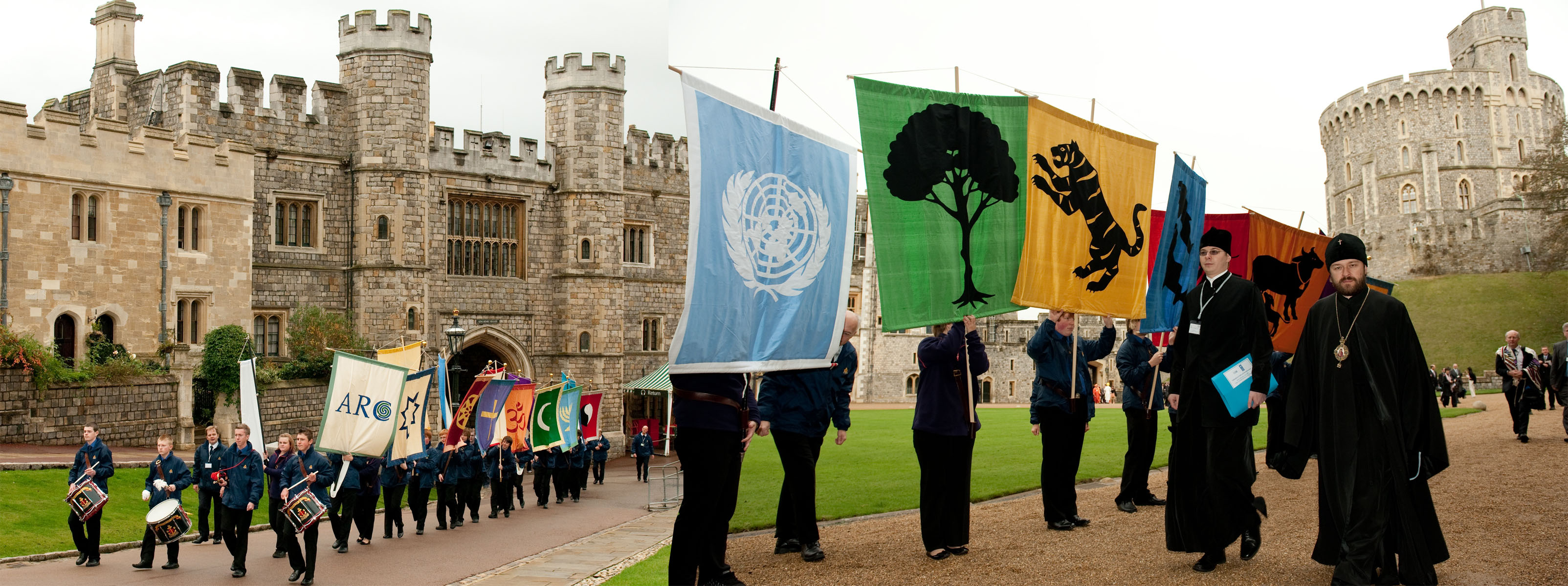 ARC posted a series of photographs on Flickr from which I choose two + the official caption: "Members of the Boys' and Girls' Brigade, playing instruments and carrying banners, lead the procession of religious and secular delegates towards Windsor Castle on November 3, 2009. Faith leaders from around the world met in Windsor, UK, in November 2009, to launch more than 30 long-term practical action plans “to protect the living planet”. The Windsor Celebration, hosted by HRH The Prince Philip and attended by United Nations Secretary-General, His Excellency Mr Ban Ki-moon, marked the largest ever commitment by the faiths to environmental action. (checking the Flickr photo site to study the iconography of the conference is a real treat for students of church and state pomp; tj.).