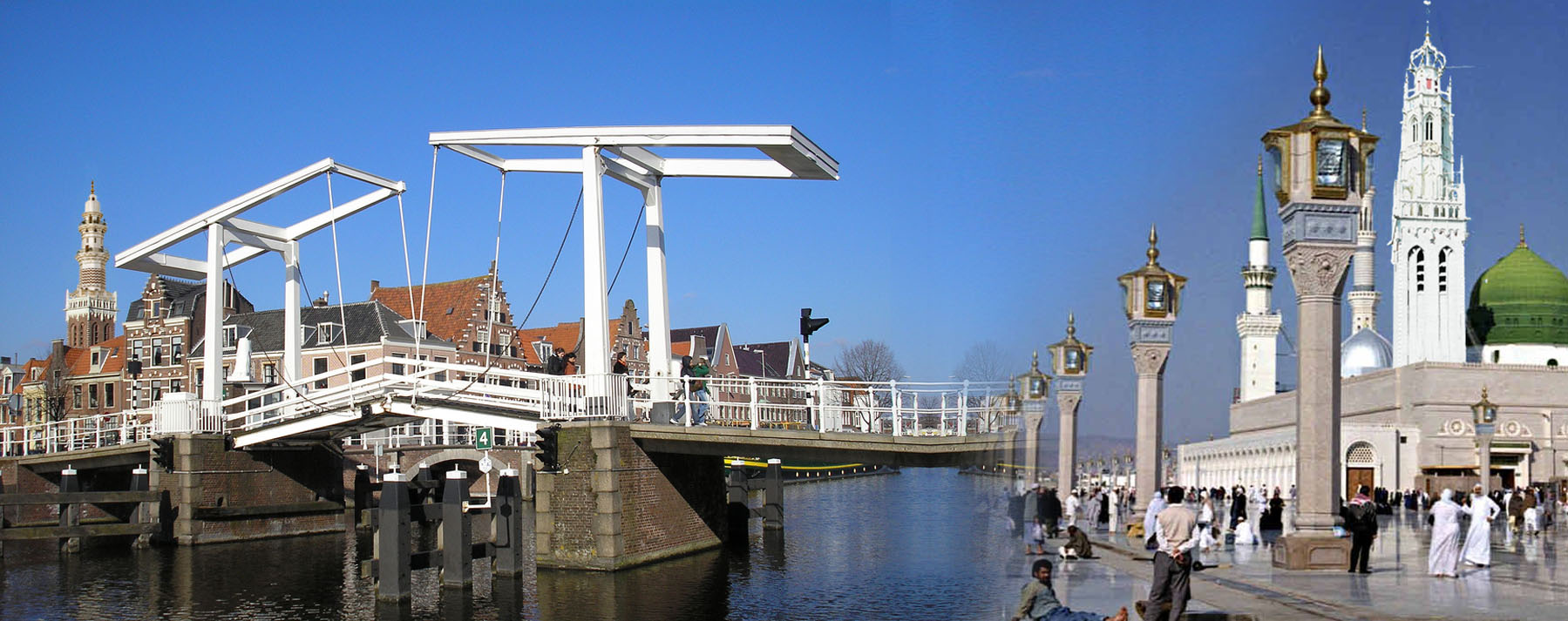 The fine silhouette of the 16th century Bakernes church tower in Haarlem compared with the Masjid Nabawi (Prophet's Mosque) minaret in Medina.