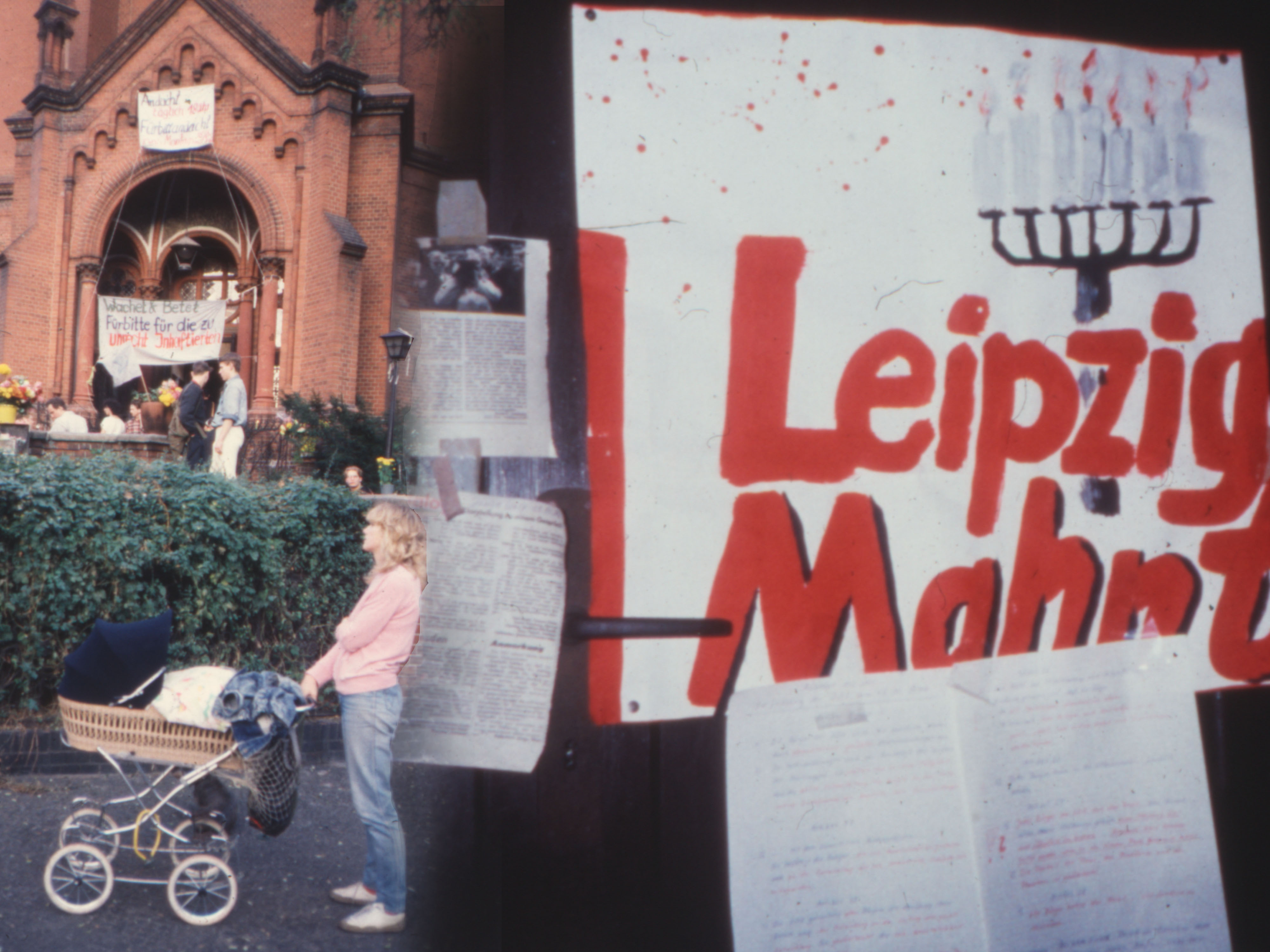 October 1989 East Berlin several evangelic churches functioning as action centers. Banners are calling for the support of those arrested, flowers have been brought into the church and on the steps outside; inside the rather darkish church space the walls are covered with newspaper cuttings put up with plaster as sellotape is something not readily available; a handwritten placard points to the example of the October 9 demonstration in Leipzig. What I remember the most was how primitive and endearing this first free communication wall was. What you see here is: freedom of expression at the stage of a foetus.