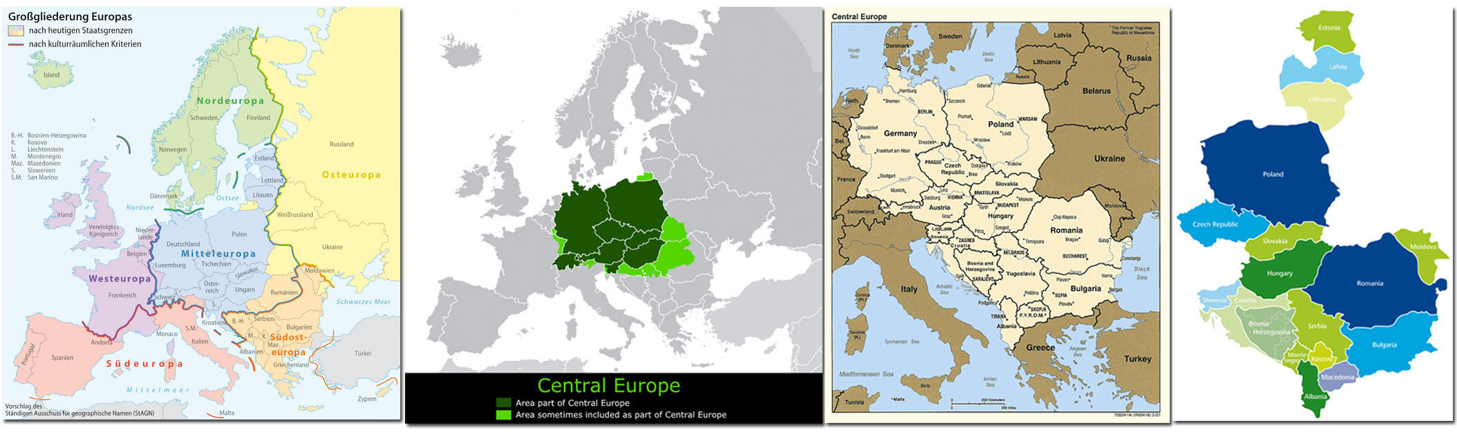 Earlier in 1989 the iron curtain – however rusty – was still in place, the great divide between Western and Eastern Europe. Block-thinking was predominant: First World (capitalist), Second World (socialist) and Third World (poor and revolting). A long curving line from the Baltic Sea to the Mediterranean split Europe, separated it physical in two opposing political systems. Europe was a plural word at that time. The geographical Europe as could be found in atlases and maps reaching till the Urals, and two socio-political Europes: Western Europe and Eastern Europe. Culturally speaking, that what was East of that fenced line was considered by the Westsiders NOT even part of their idea of Europe (something like the actual perception of Turkey as something that should not be part of the EEC). In the end all this bickering over meaning of pseudo geographic entities has long be understood by the United Nations personnel  as can be read in a report of the UN commission on toponymic issues that had to make an assessment for “A Subdivision of Europe into Larger Regions by Cultural Criteria” and concluded: “every assessment of spatial identities is essentially a social and cultural construct.” The report – using shady diplomatic language – comes up with the conclusion that the notion of “East Europe” based on the Russian Empire from the 16th to the 20th century and the Soviet period from 1917 to 1992 and its sphere of influence is over now and the traditional idea of “Central Europe” can once more be established. I can not find the promised maps of this commission and when one does only a quick check anybody can see that more than one mapping of the idea of Central Europe exists.
