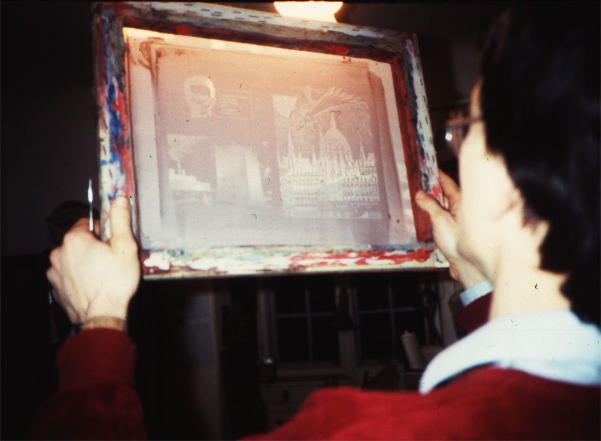 Budapest winter 1986, Jennö Nagy holds a silscren frame of the cover of his handprinted magazine 'Demokrater' in his suburbian house (that has been raided several times by the police confiscating even this primary tools). His printing set is now in the collection of the International Institute of Social History... I must have better pictures, but this is all what I could find for the moment. It shows nevertheless how such simple devices were seen as and could actually be 'a danger of the state'.
