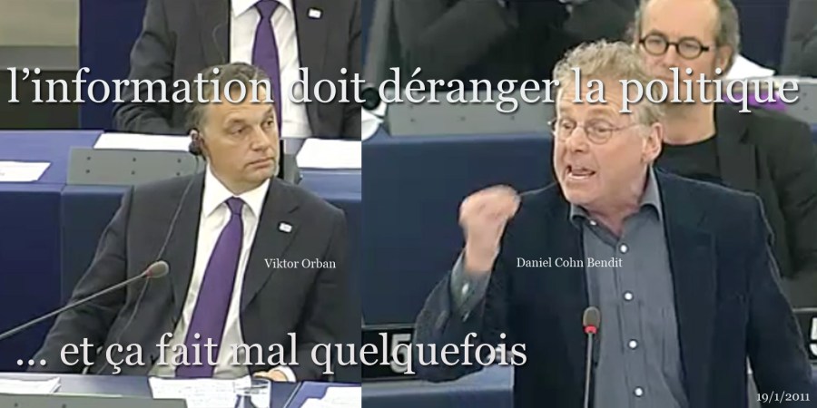 Daniel Cohn Bendit is an old style orator who loves to be on stage and debate, from the university back rooms of Nanterre in the mid sixties as a ‘young European anarchist’ and explicit anti-parlementarist, to the the front room of the European parliament in Strasbourg and Bruxelles as an elected deputé of the Green Party. Yesterday I saw on French television TV5 a snippet of his discourse against Viktor Orban, Hungarian President, comparing Orban’s position with that of Chavez and Fidel Castro.