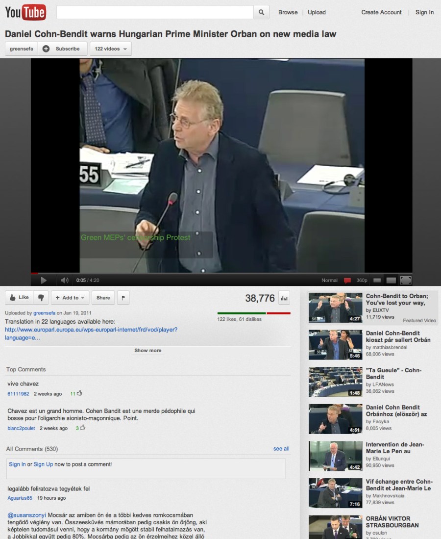 When one sees this Youtube version of the Cohn Bendit debate in the European Parliament not embedded here but on the Youtube page, scandalous racist hate viewer comments are on public display, as well as the moderate and supportive ones. All this seems ‘unmoderated’. This is not “information équilibré” and one must have a harnessed soul to read many of the comments. The relative anonymity  of the internet produces such reactions and its is up to any internet community to keep excesses under control.