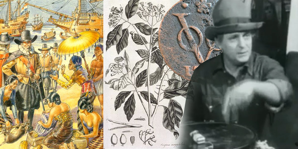 Recent Indonesian history depiction of the arrival of the brothers Cornelis and Frederik de Houtman at the Bantam (west coast of Java) in 1596, the picture does not show the firing of ship canons at the native settlements as a result of animosity between the locals, the Portugese and the Dutch. The middle picture is a drawing of the pepper plant from the VOC archives, at the right Robert Jasper Grootveld (1977) while talking about the origin of Dutch drug-trade and the importance to keep everything ‘droog’ (dry), the origin of the word ‘drugs’.