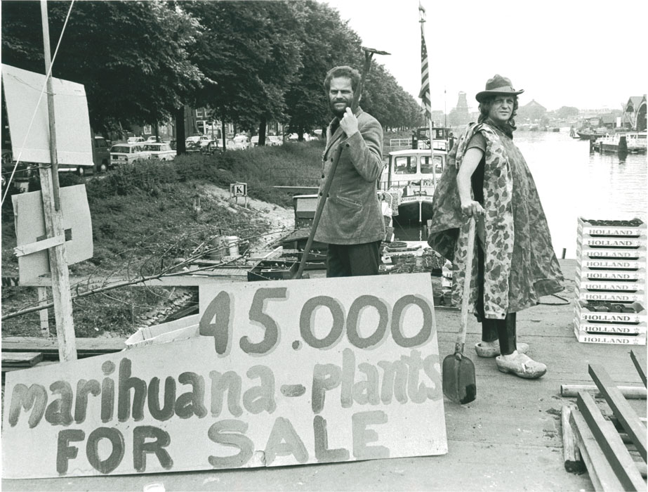 This photograph by Cor Jaring (****) is from 1971 and shows the boat ‘De Witte Raaf’ (the White Raven) moored straight opposite the local Amsterdam police station of Kattenburg, selling marihuana plants, for one guilder each. We see Kees Hoekert at the left and on the right (with a spade and ‘klompen’) Robert Jasper Grootveld. It is a playful subversive enterprise under the name “Lowland Weed Company.” At that time someone had studied the Dutch anti-opium law and had discovered that it banned only explicitly the dried leaves of this plant. Growing plants were not subject to this law and it is through this loophole in the jurisdiction that the wide use of this soft-drug and the soft drug tolerance policy of Dutch authorities came into existence. Grootveld who had been active as an anti-smoke-magician fighting the big Tobacco industry in his own unique ways (because of cancer danger of regular cigarets) had been using and propagating marihuana (instead) from early on. It is at the end of the sixties and the very beginning of the seventies, with the influx of hippies and other young people traveling around cheaply by hitchhiking, that a new form of tourism started to develop in Amsterdam. At first the young people often slept outdoors on the steps of the National Monument at the Dam Square and in the Vondelpark. Outdoor sleeping was soon regulated by limiting the permitted areas and providing cheap accommodation called ‘sleep-inns’, a kind of hip youth hostels, that often provide some cultural program at the side. Youth clubs came into existence, some of them squatted at first but soon legalized, others initiated by the city government who tried to get the youngsters of the street by offering them music and dancing halls. Local cannabis production (nederwiet) was sold in small quantities in these venues. The whole multi-million recreational drug industry originates in this chain of sub-cultural events.