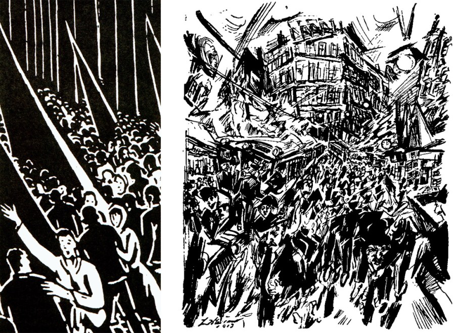 I montaged two modernistic tourist photographs in this illustration, photographs I found on Flickr, made by a man posting under the alias ‘Urbandiscount’; a photographer with a talent for catching the atmosphere, better than most regular flat tourist photographs (**). Click picture for full size view.