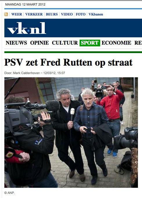 Wat bracht mij ertoe om deze ‘détournement’ (verdraaiing/omdraaiing) te maken? Pas nu ik er een dag later naar terugkijk zie ik in wat mij spontaan tot het maken van dit plaatje dreef: die hele media-heiza rondom het ontslag van wat gewoonweg een trainer bij een voetbalclub is die een raar soort arbeidscontract heeft zodat ze hem – als het de bestuurders niet langer zint – zo de laan uit kunnen sturen. De hele voorgaande week al zag ik steeds die naam ‘Rutten’ en aangezien ik verre van voetbalminnend ben zag ik de letter ‘n’ na het woord ‘Rutte’ eerst over het hoofd. “Zou het om een broer van Mark Rutte gaan”, dacht ik? Dan was er de entourage met al die camera’s en fotografen in het beeld, alsof het om een kabinetscrisis ging. Dieper liggend dan nog de dictatoriale associatie van een Eerste Minister die gewoon de laan uitgestuurd kan worden als zijn ‘gedoogpartner’ het niet langer zint. PSV en PVV dat is maar 1 letter verschil! Dan dringt zich – nogmaals – de praktijk van ‘het de laan uitsturen’ op, omdat er onvoldoende gepresteerd wordt. Is dat niet wat je voortdurend leest als de oppositie zich uitspreekt over het kabinet? Voetbaldoelpunten kunnen in de plaats gesteld worden van ‘Hondse opiniepeilingen’. “Onder Rutte wordt onvoldoende gescored” en “De straat op met die man!” hoor ik dan in mijn hoofd. Er is heel wat verholen deernis in gelaat en lichaamshouding van Frank Rutten op de krantenfoto’s als hij veld aan het ruimen is, iets wat van zijn bijna naamgenoot Mark Rutte niet gezegd kan worden. Het bestuur van een voetbalclub zelve, is ook weer een wankel geheel, zoals wij via de dagelijkse voorpagina-berichtgeving gedurende het afgelopen half jaar, in Telegraaf en Het Parool geleerd hebben. Zijn het niet de aandeelhouders die hun dividend missen, dan zijn het wel de leden van de supporters-vereniging die mee willen spelen. Zo worden bestuurskamers en hun inhoud regelmatig stevig door elkaar geschud, waarbij soms de bedrijfs-top zelf, op straat komt te verkeren. Zo gaat het met associëren – van iets met iets anders – er valt veel van te leren.