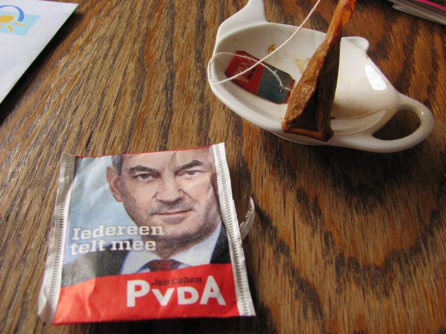 Foto geplaatst op de website van de VVD afdeling Bodegraven, waarschijnlijk in het verkiezingsjaar 2010, link bestaat niet meer. Een foto die een paar decennia later nogal onbegrijpelijk zal zijn omdat de associatie van Cohen met theedrinken (en bruggen bouwen) dan wellicht uit het collectieve geheugen gewist is. (2)