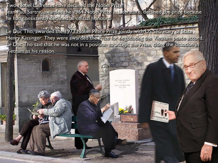 The grave of Jean-Paul Sartre and Simone de Beauvoir at the Cimetière du Montparnasse Paris where those who accepted the Nobel Peace Prize pay homage to the ones who were so noble to refuse... and are known to enjoy their clear conscience on sunny days, sitting on their bench of honor. As Afghanistan is a breeding ground for war, several more Nobel Peace Prize winners may be produced by it in the future... it will only end with an Afghan as a Nobel Peace Prize candidate who will gladly decline the honor to surmount any local rivalry and finally make actual peace... Click picture for full size view.